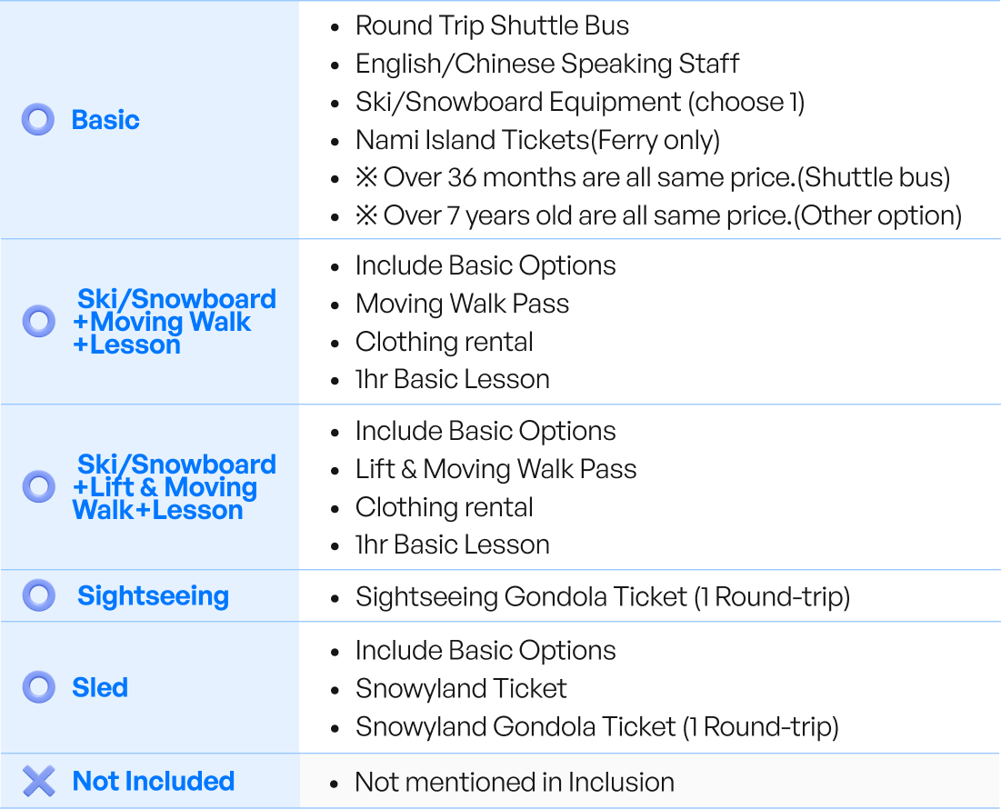 5. Infant (International age 0~2) is free and no seats occupancy. (Except Snowsled option)