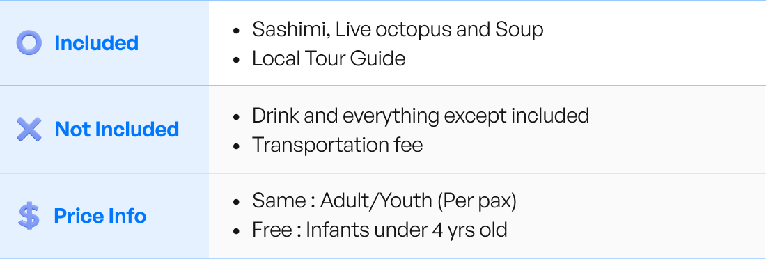 • Not required you to do extra shopping or extra tip! You can fully enjoy the Noryangjin fish market!