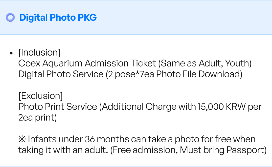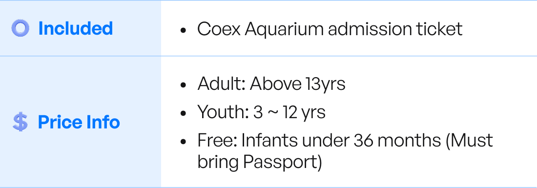 • Only for those who visit the Aquarium on the very date of reservation, you can get a parking discount of up to a maximum of 4 hours as you parking at the Coex mall public parking lot (4,800 won[KRW]).